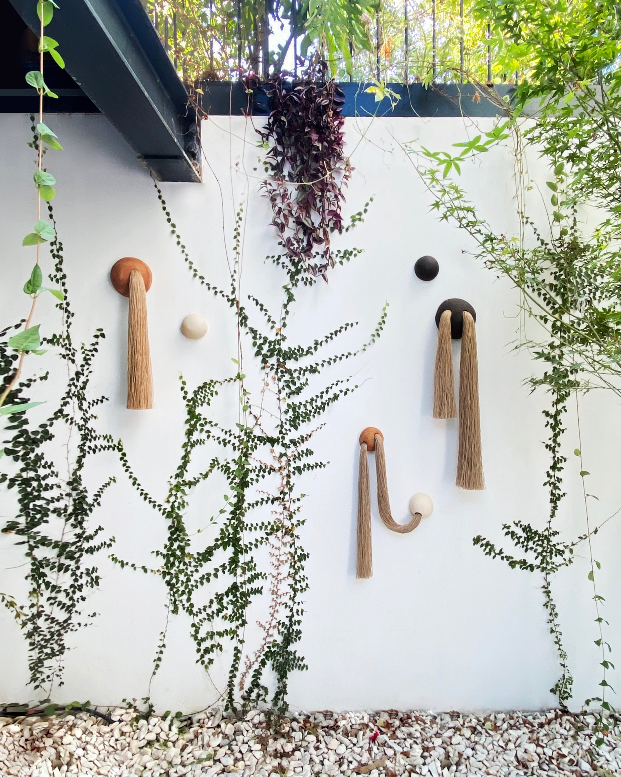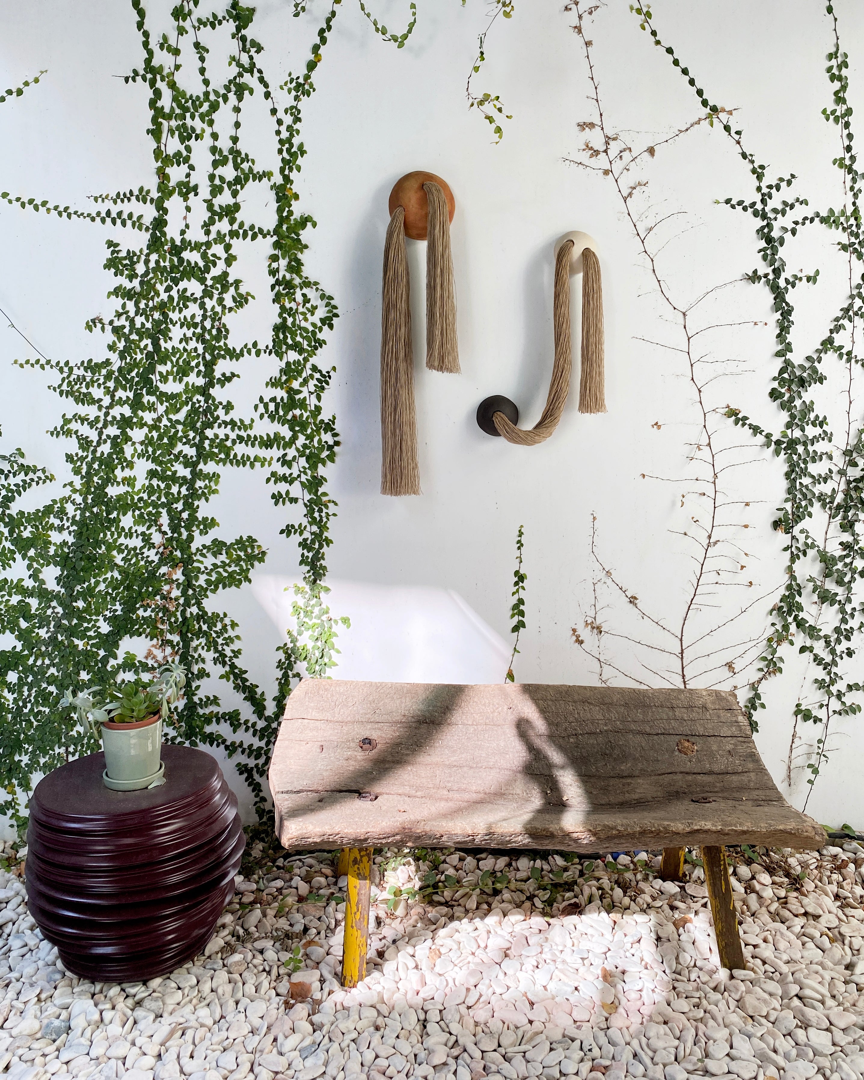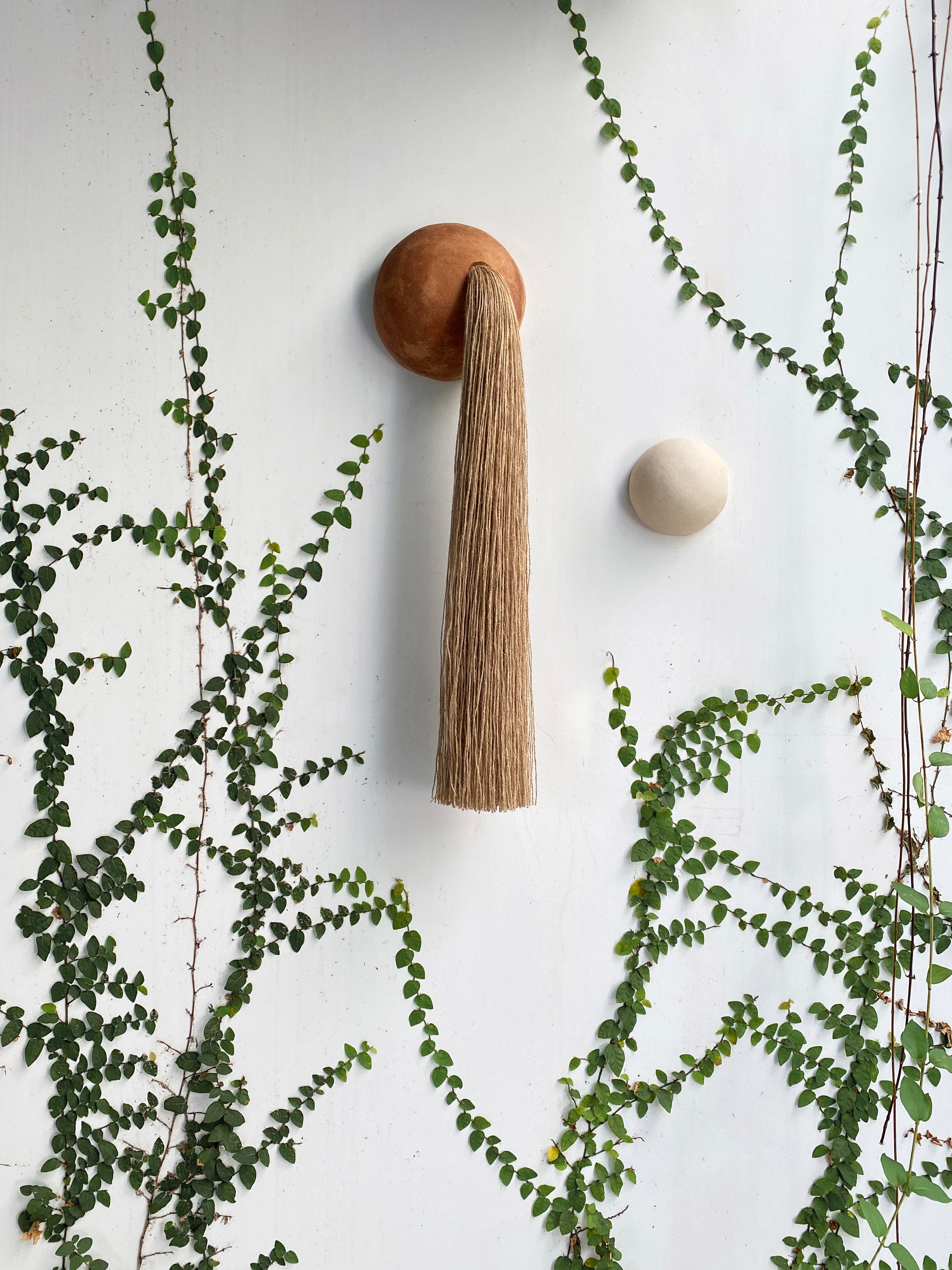 The installation explores the empty space left by nature, complementing it with ceramic and jute textures, in a harmonious and fun way.