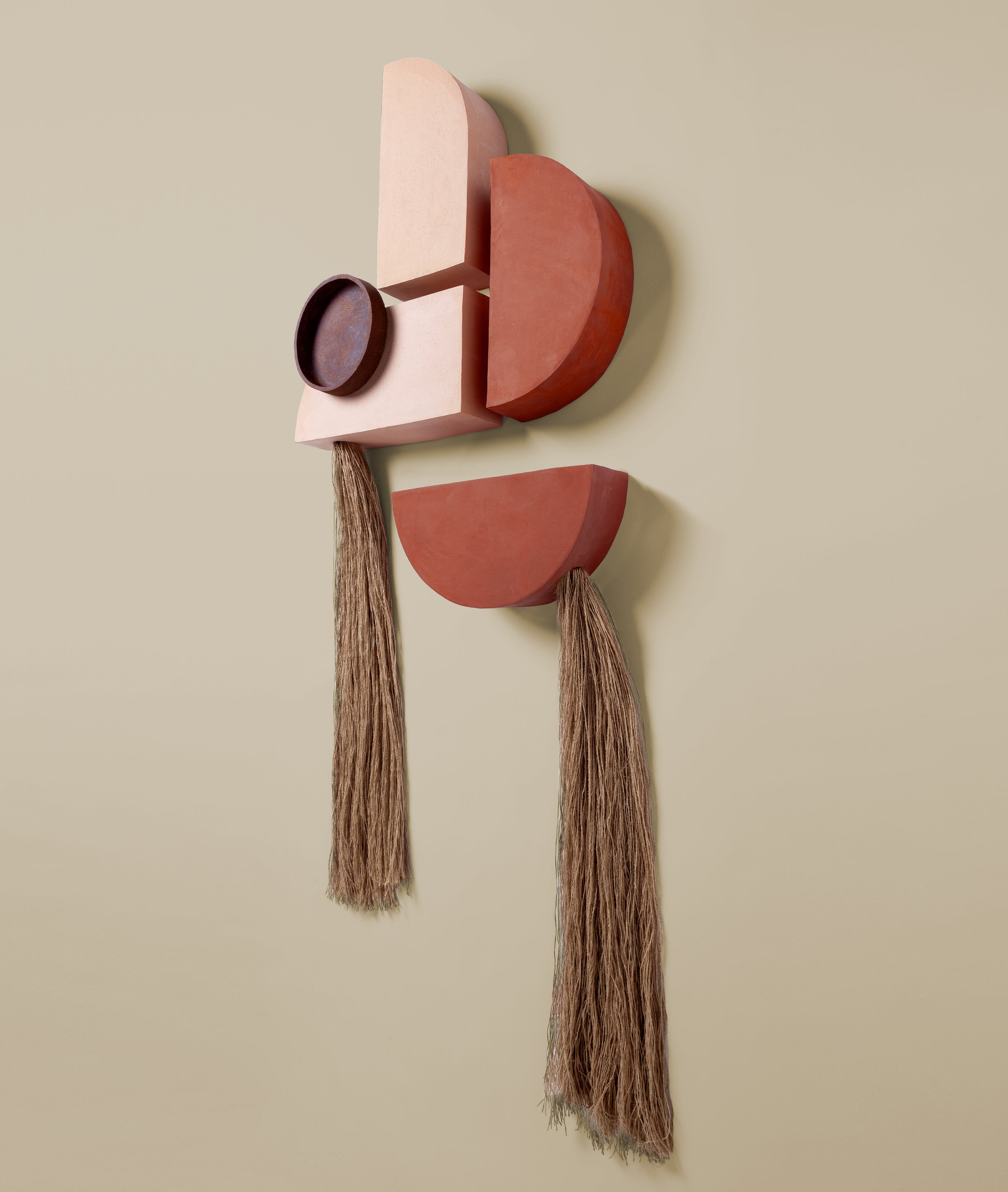 The handcrafted sculptures combine stoneware and jute elements, allowing for geometric boldness to intertwine seamlessly with natural textures.