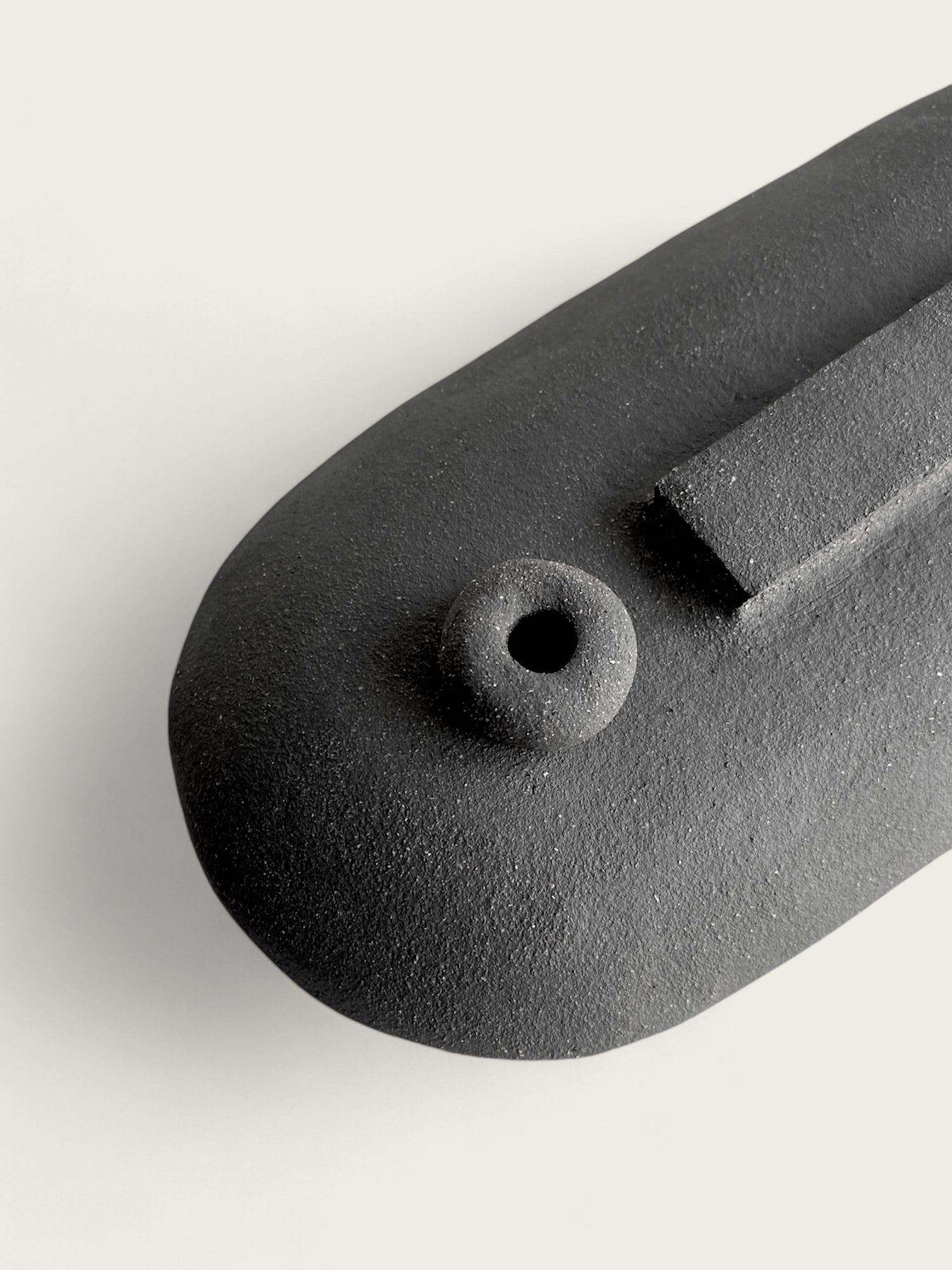 The high temperature allows the black stoneware clay to reach deep dark hues, that perfectly complement the shadow effects of the piece. The asymmetrical eye creates a dynamic visual effect, adding a distinct focal point to the mask.