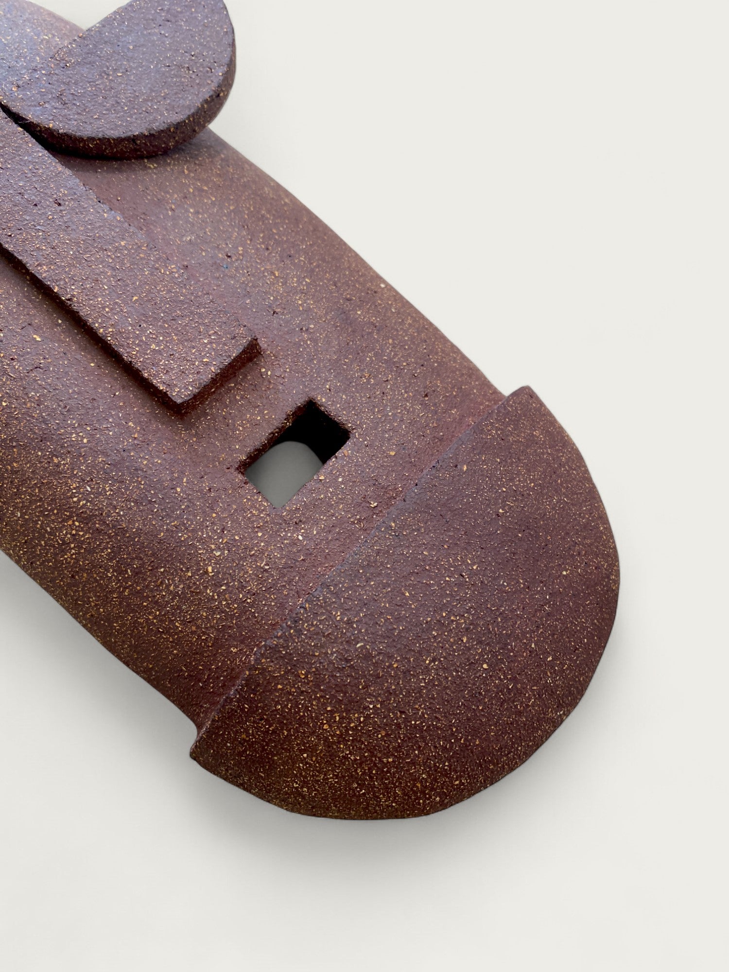 The rich aubergine and purple shades of this clay are paired perfectly with a warm sandy texture. The asymmetrical eye creates a dynamic visual effect, adding a distinct focal point to the mask.