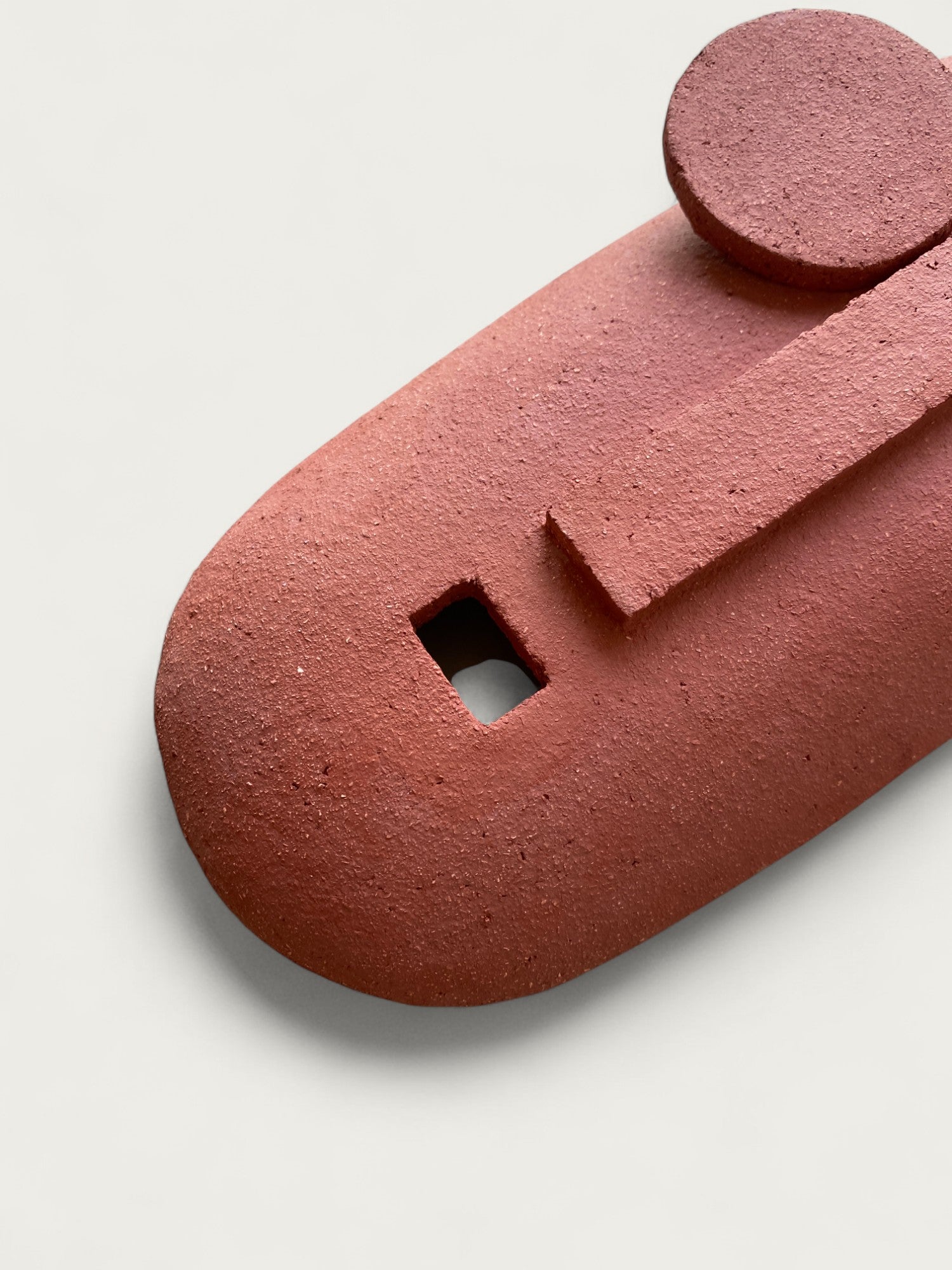 The earthy red stoneware clay creates unique and captivating pieces, lending them a grounded and natural quality. The asymmetrical eye creates a dynamic visual effect, adding a distinct focal point to the mask.