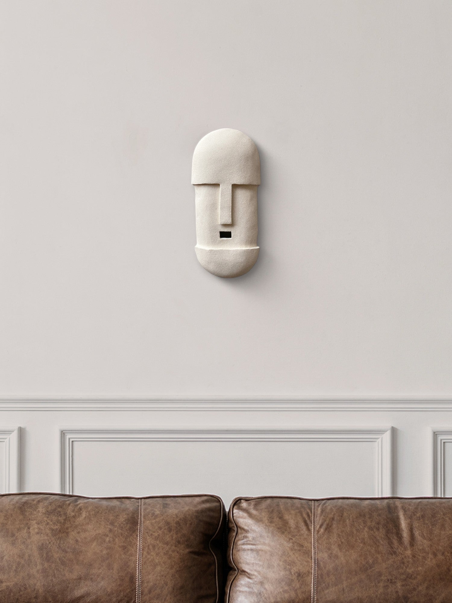 The minimalist white stoneware clay truly enhances the different shapes of the piece, allowing them to stand out with a greater contrast. The minimal lines of the mask emphasize a sense of geometric simplicity, combining it with an organic feel.
